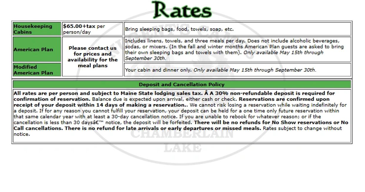 All rates are per person and subject to Maine State lodging sales tax. A 30% non-refundable deposit is required for confirmation of reservation. Balance due is expected upon arrival, either cash or check. Reservations are confirmed upon receipt of your deposit within 14 days of making a reservation.. We cannot risk losing a reservation while waiting indefinitely for a deposit. If for any reason you cannot fulfill your reservation, your deposit can be held for a one time only future reservation within that same calendar year with at least a 30-day cancellation notice. If you are unable to rebook for whatever reason; or if the cancellation is less than 30 days notice, the deposit will be forfeited. There will be no refunds for No Show reservations or No Call cancellations. There is no refund for late arrivals or early departures or missed meals. Rates subject to change without